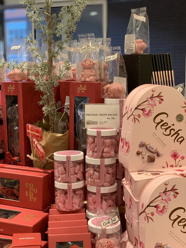 "Kvalitets- og håndlavet chokolade, veganske og glutenfrie lækkerier, lakridser i alle afskygninger, sjovt børneslik, stort udvalg af is, vine fra hele verden, altid specialøl fra de bedste bryggerier, spiritus for selv den vildeste kender, danske specialiteter i høj kvalitet, tapas med vin, hygge og altid masser af smil,”