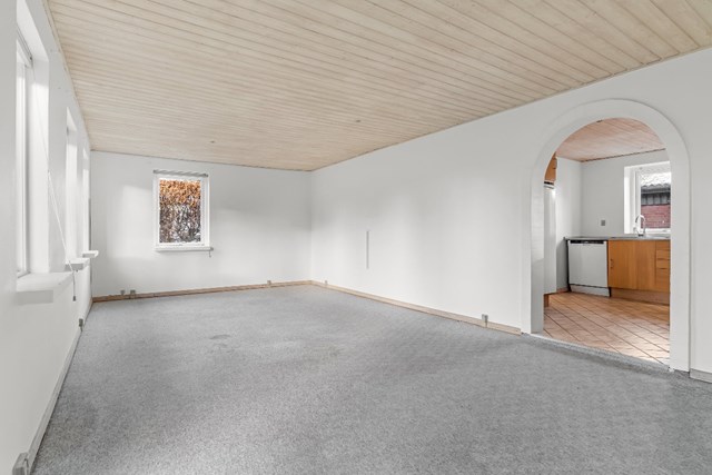 Boligens indretning byder på entre samt lyst badeværelse med bruseniche. Dertil kommer et køkken/alrum med trappen til tageetagen. Desuden rummer stueplanen en stue med udgang til terrasse/have og et værelse.