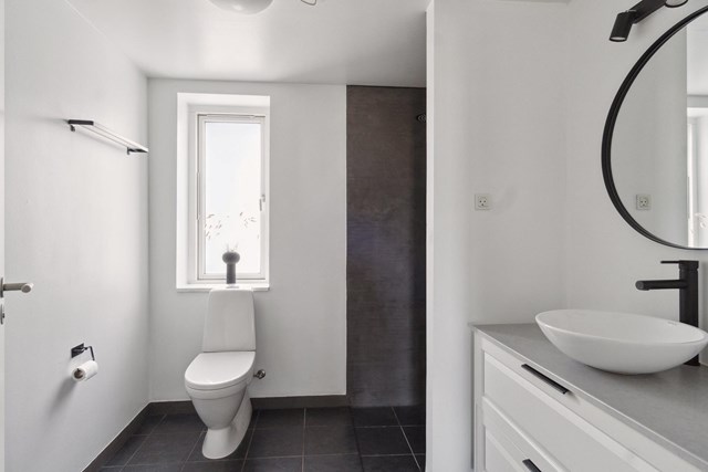 Badeværelset, der har en bruseniche, samt et praktisk vaskerum og ekstra opbevaringsrum, fuldender boligens funktionelle indretning.