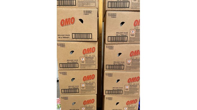 Min købmand i Asp tilbyder kasse med flydende Omo Color vaskemiddel til skarp pris