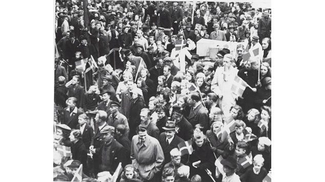 En folkemængde fejrer Danmarks befrielse. Store Torv, Holstebro, 1945.