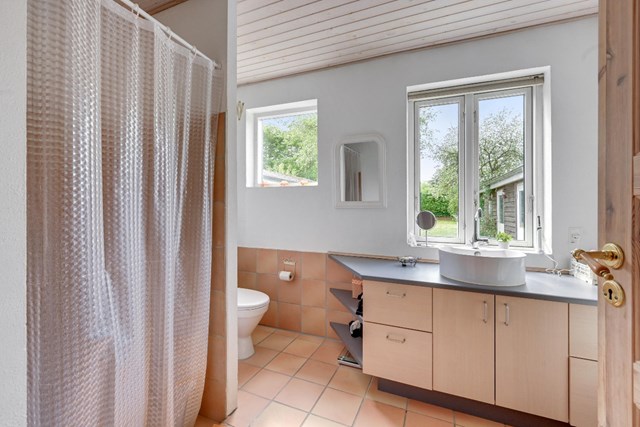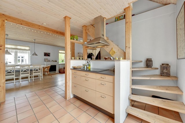 Videre ind i huset ligger det lyse køkken godt med skabs- og skuffeplads samt udgang til flisebelagt terrasse/gårdhave.