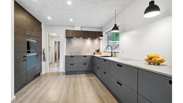 Huset består af et stort grågrønne køkkenalrum med gode opbevaringsmuligheder, som smelter sammen med stuen og skaber et godt fællesmiljø for huset.