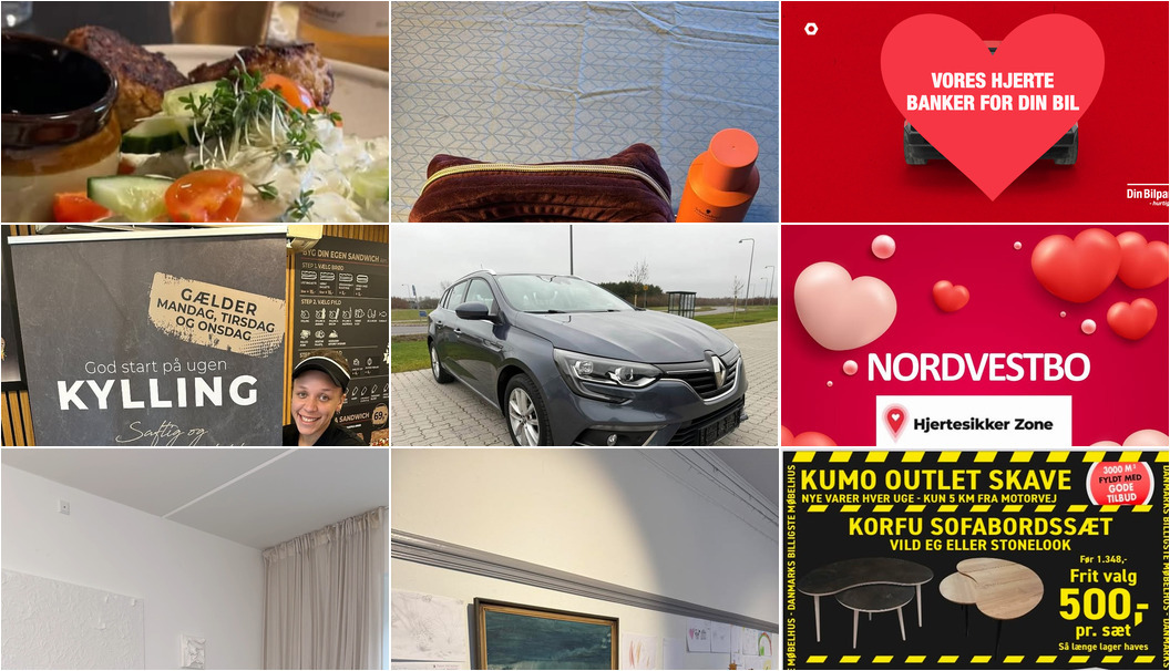 Møblér med Kumo Holstebro fremhæver deres Glasgow-sofa og inviterer kunder til at besøge butikken for at realisere deres boligdrømme. Brink's - A Matter Of Style har ledige tider til klip og farve i weekenden. COMBI FRISØREN fejrer Valentinsdag med en konkurrence om en toilettaske og uddeler hjerte-chokolade til kunderne. NordVestBO markerer Valentinsdag ved at fremhæve deres Hjertesikre Zoner og hjertestartere i deres afdelinger. Min Købmand i Asp tilbyder hamburgerkød til en speciel pris, mens Kylling & Co Holstebro har halv kylling til en nedsat pris på udvalgte dage i februar. Notfaraway i Fjaltring inviterer til frokost med hjemmelavede frikadeller og kartoffelsalat, og børn kan bage pandekager gratis.
