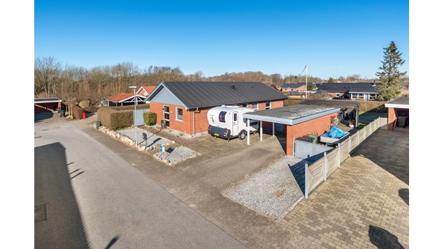 Huset er placeret på en 750 m2 grund, hvor der både er fundet plads til at skabe et godt parkeringsareal i forbindelse med huset og 27 m2 carport/værksted og samtidig en stor, men meget overskuelig have, hvor der er masser af plads til aktiviteter, boldspil mv.
