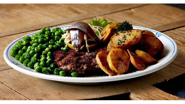 Raadhusbøf - hakkebøf serveret med ærter, pommes frites og hjemmerørt bearnaisesauce