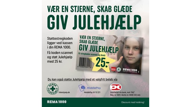 Vi har fået støttestregkoder ved kassen. Få scannet en af støttestregkoderne og donér 25 kr. til Julehjælp, så er du med til at gøre en forskel for familier, der har brug for en hånd i julen