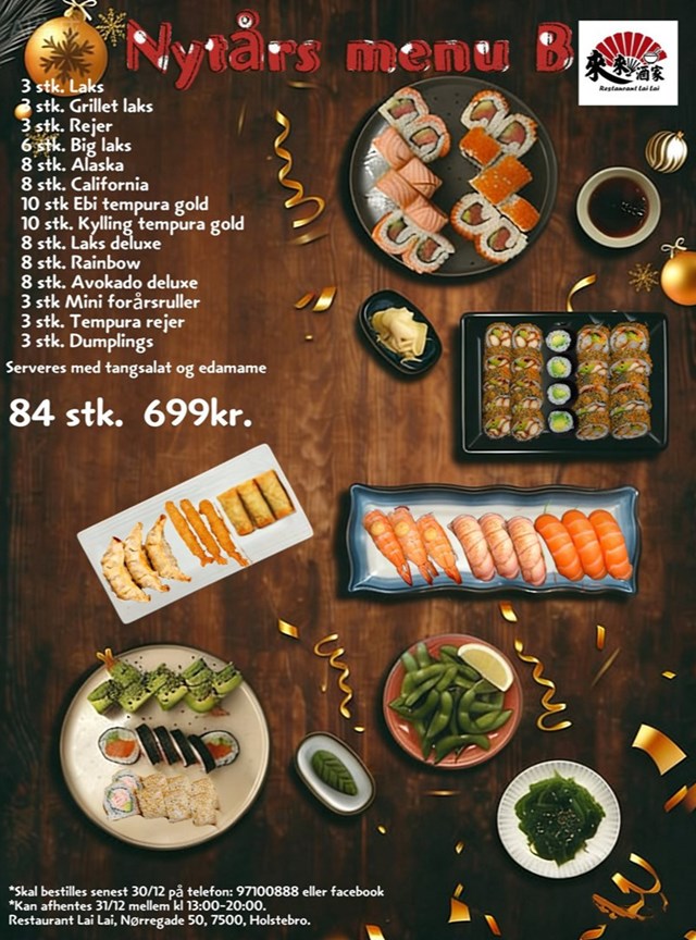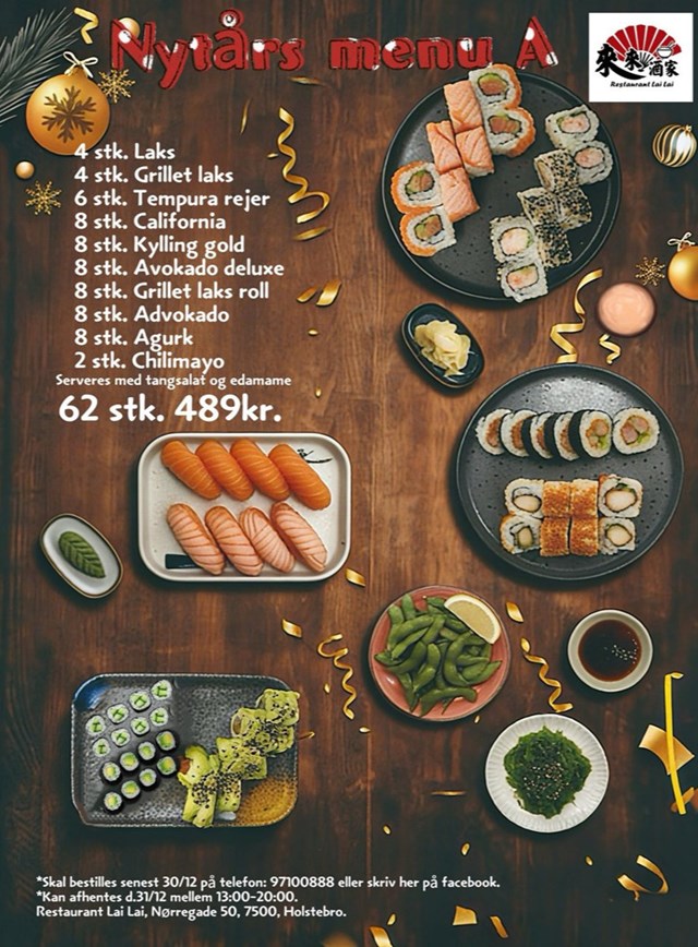 Skal I sikre jer en himmelsk nytårsaften, kan menuen blive jeres ved at bestille direkte på Restaurant Lai Lai's hjemmeside, eller ringe til dem på tlf: 97100888.