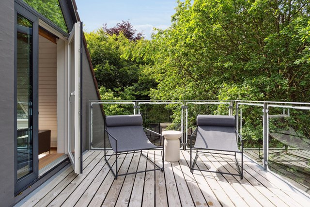 Der er gulvvarme i hele boligen, foruden værelserne, walk-in-closet samt stuen på førstesalen og skal det være hyggeligt kan der tændes op i brændeovnen. I får fornøjelsen af tre værelser, der fordeler sig ideelt med to i stueplanet og et på førstesalen. Heroppe er loft og glaspartiet ført til kip, så sløret løftes for de synlige hanebånd, og I samtidig får mulighed for at nyde udsigten fra sofaen eller altanen.