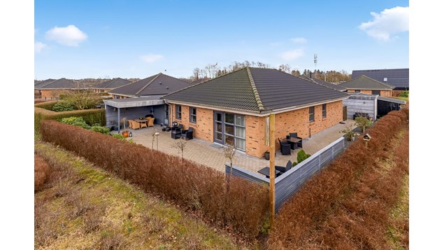 Huset er opført i tidløse materialer med antracitgrå træ-/alu-vinduer, sort betontag og med gennemgående gulvvarme. Boligen rummer 133 veldisponerede kvadratmeter, der omfatter en entré, 3 værelser og et pænt badeværelse. Køkken/alrummet og stuen ligger i åben forbindelse og skaber et lyst og rummeligt opholdsmiljø, hvor det tidløse køkken integreres harmonisk. Fra det store opholdsrum er der direkte udgang til en dejlig terrasse. Derudover byder boligen på et separat bryggers med vaskefaciliteter - praktisk placeret mellem carporten og køkkenet.