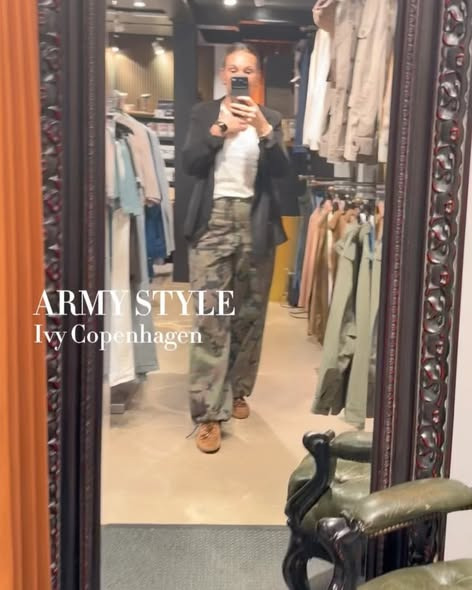 Nyhed fra @ivycopenhagen, nemlig denne cool army cargo pant Stylet med en almindelig hvid tee og en sort blazer