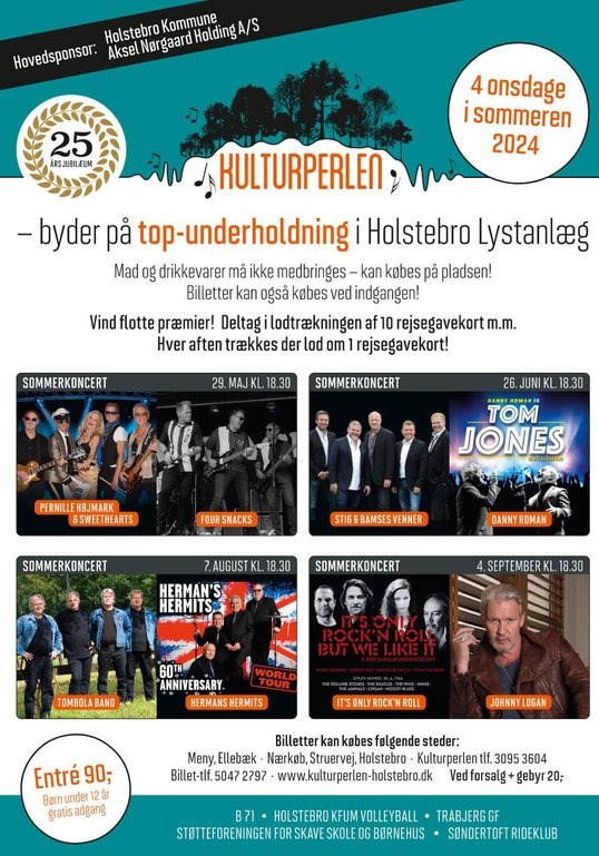 Kulturperlens onsdagsarragementer fejrer 25 års jubilæum, Stig og Bamses Venner fejrer 10 års jubilæum hos os, Johnny Logan har også besøgt os i 10 år nu, og sidst men ikke mindst fejrer vi også Herman’s Hermits 60 års scenejubilæum i år, fortæller Kulturperlens formand, Poul Hornshøj.